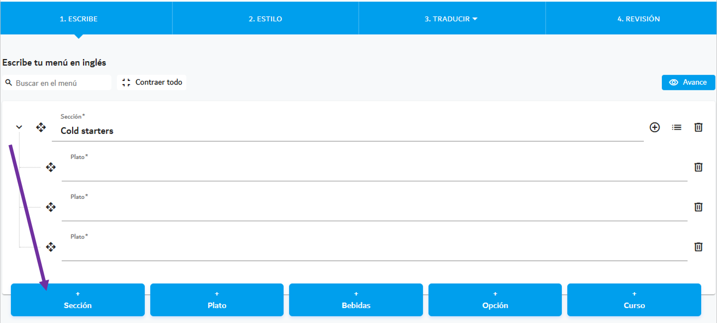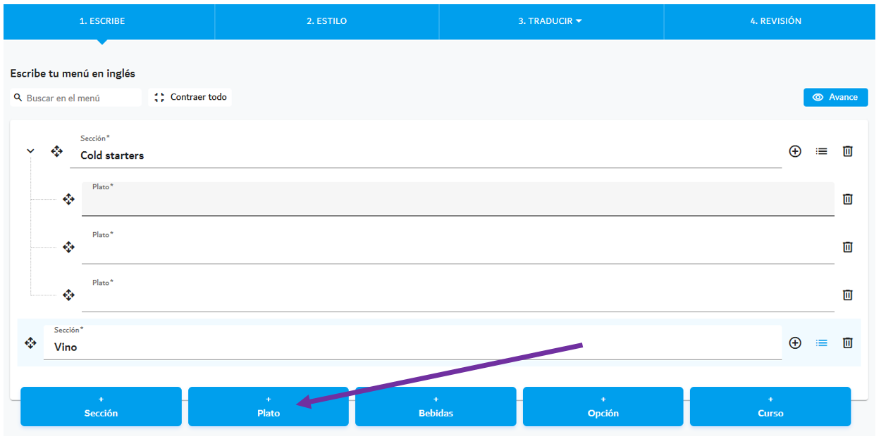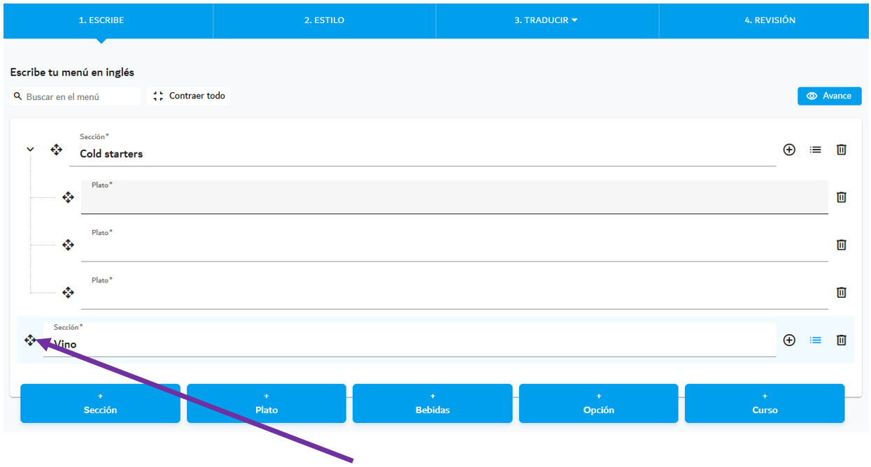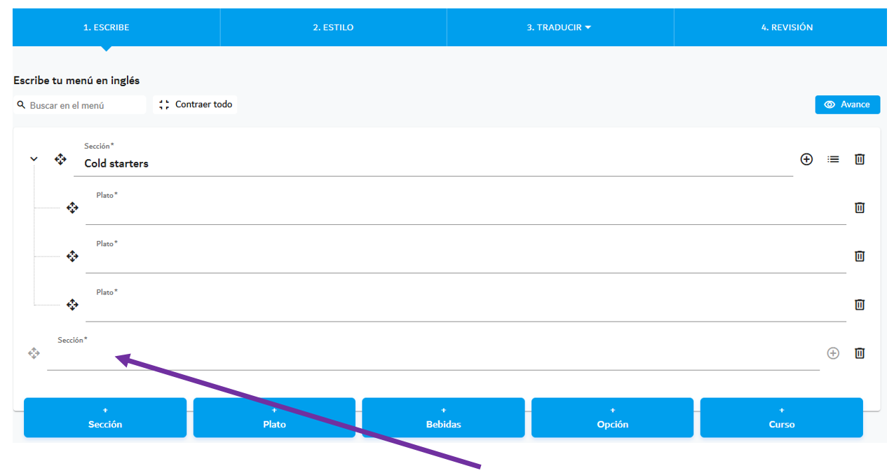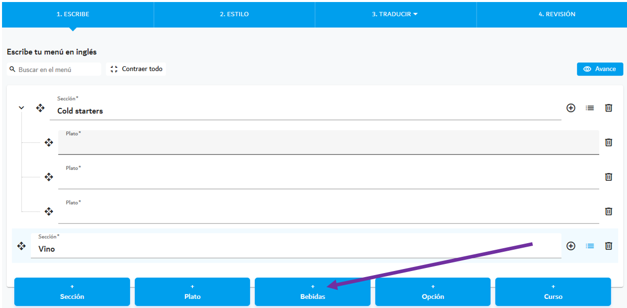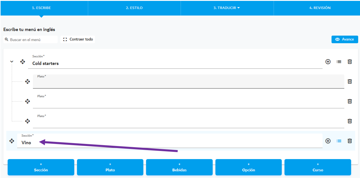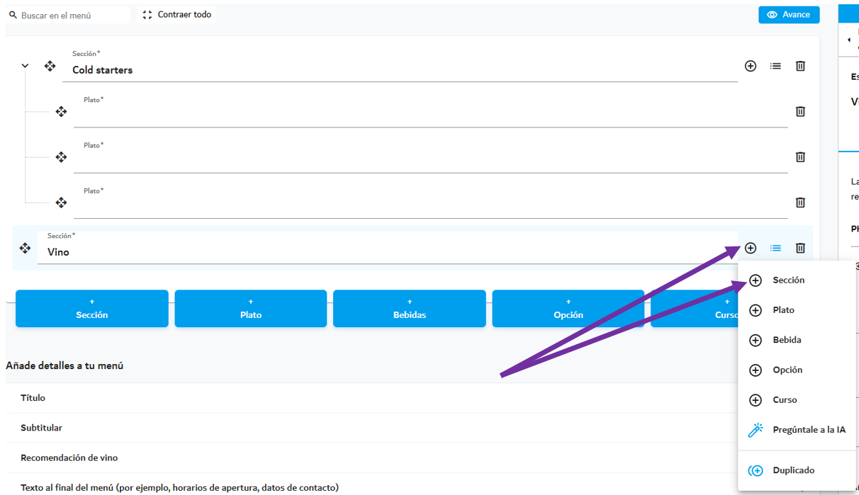El proceso para crear platos, vinos y bebidas es el mismo que el de crear una sección. Así es como se hace: