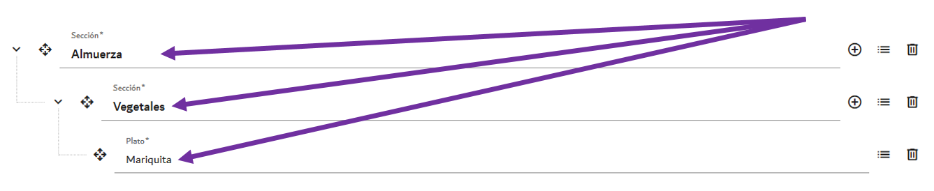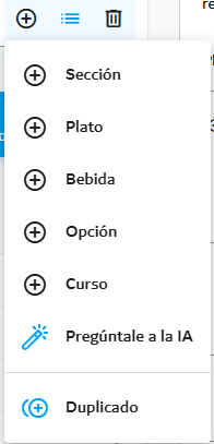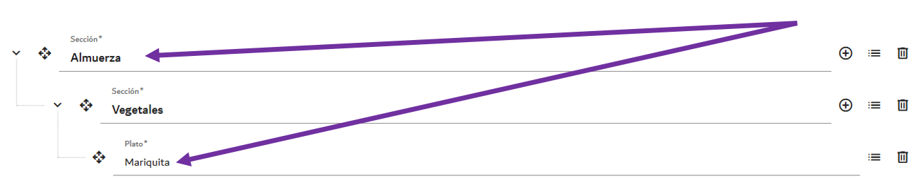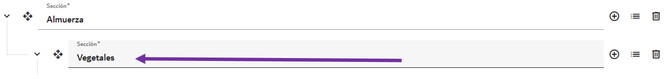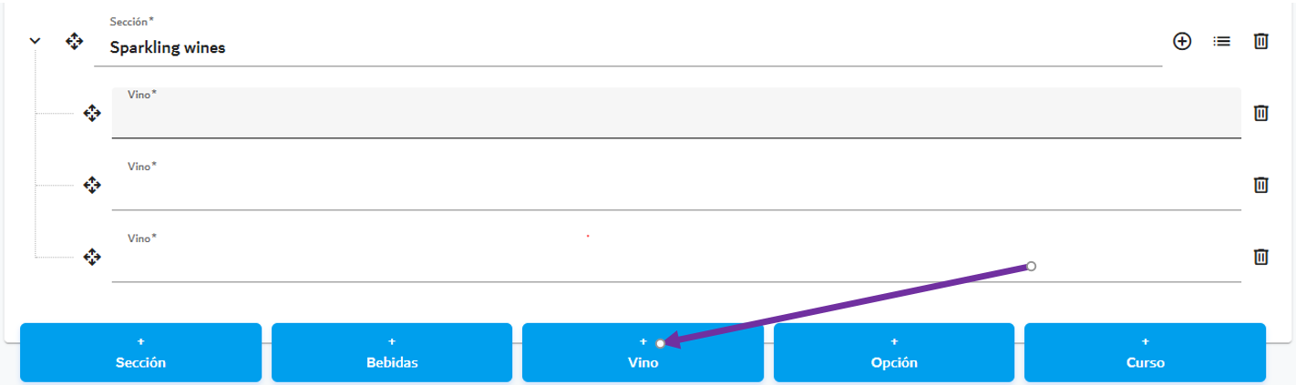 - Después de crear las subsecciones, puede agregar elementos específicos de cada subsección: Plato, Bebida, Vino: